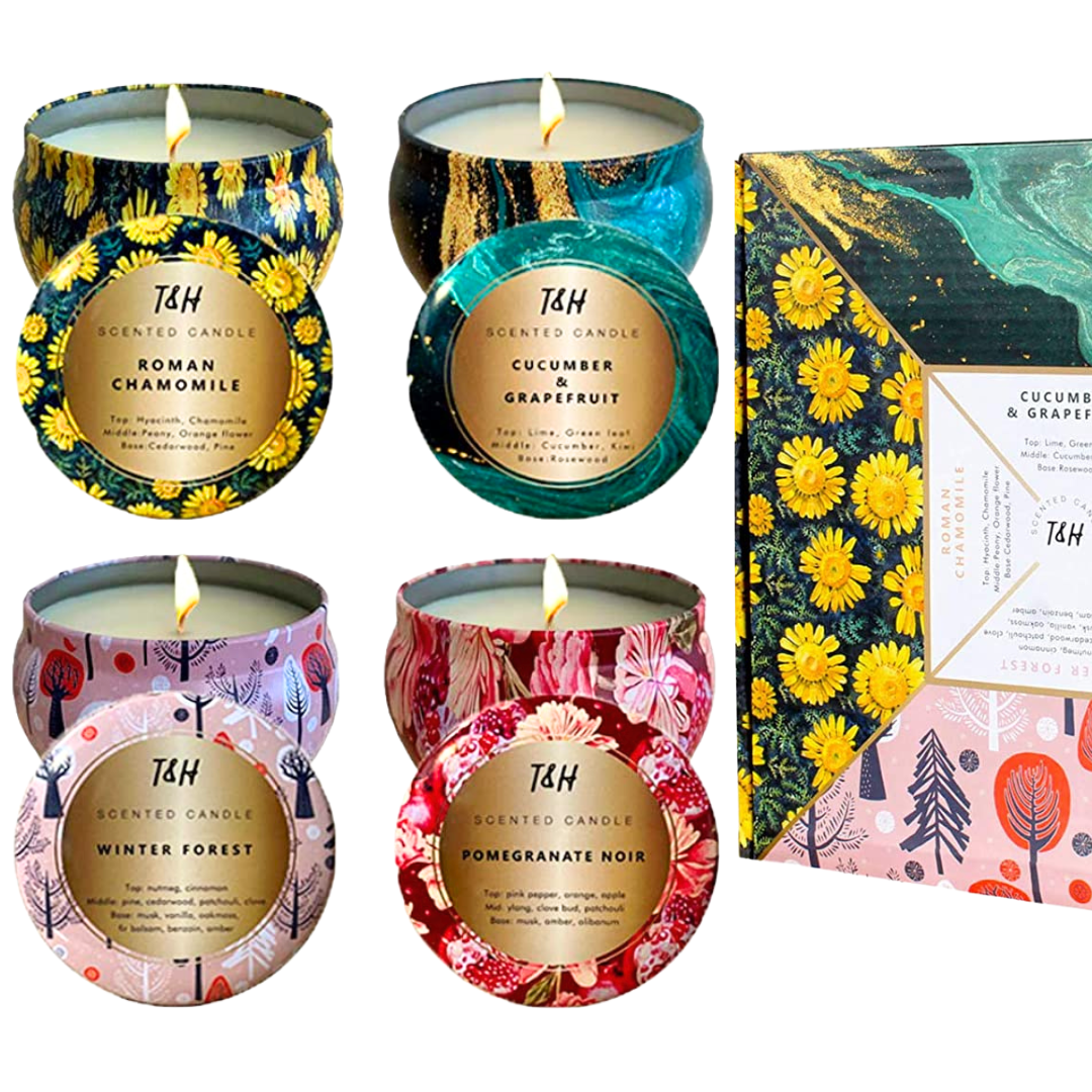 🔥 Our 6 oz candle gift set of 4 will fill your room with uplifting scents of Cucumber and Grapefruit, Pomegranate Noir, Winter Forest, and Roman Chamomile essential oils. These refreshing, earthy fragrances will evoke a sense of comfort and indulgence to perfectly match the mood of every season. Made from pure soy wax, essential oils, and cotton wicks. Hand poured into round tins with metal lids.